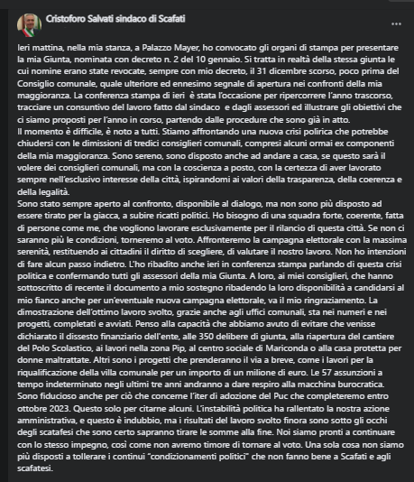 Il primo cittadino, che ha ripresentato la sua Giunta che aveva momentaneamente congelato per trovare una soluzione alla crisi politica, l’ennesima, ha manifestato tutta la su amarezza in un post pubblicato qualche ora fa.