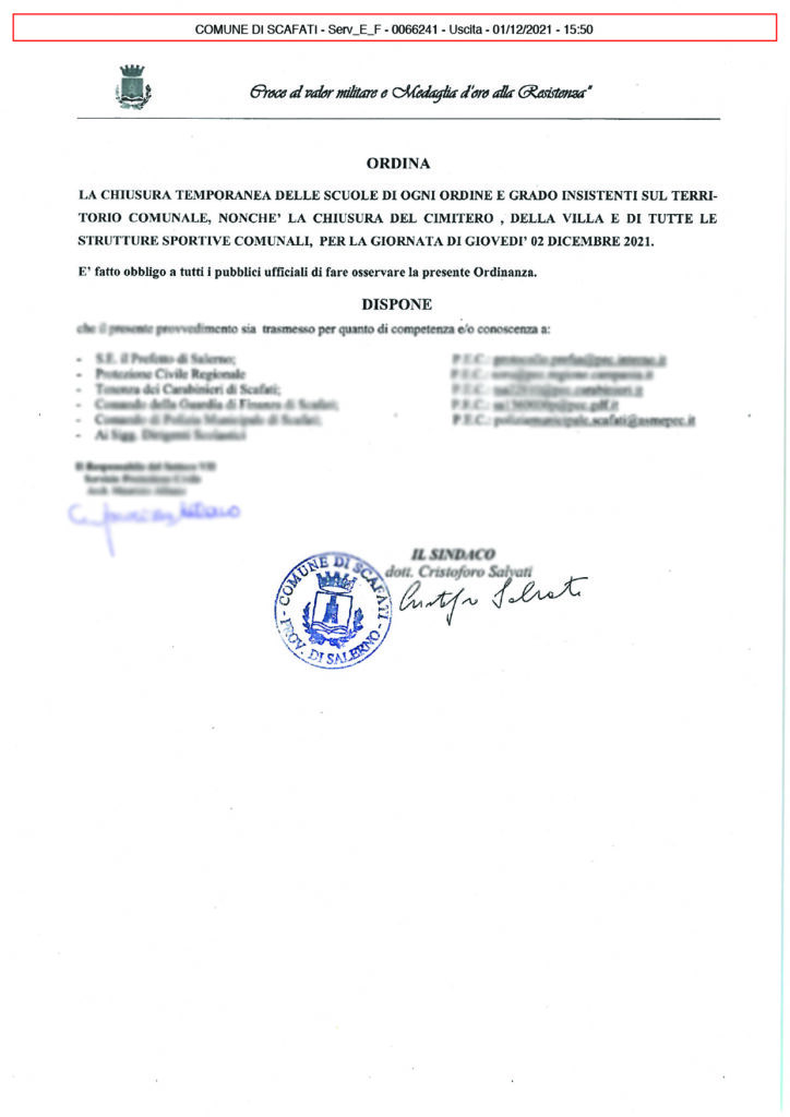 scuole del territorio, della Villa comunale, del cimitero e di tutte le strutture sportive comunali per la giornata di giovedì 2 dicembre,