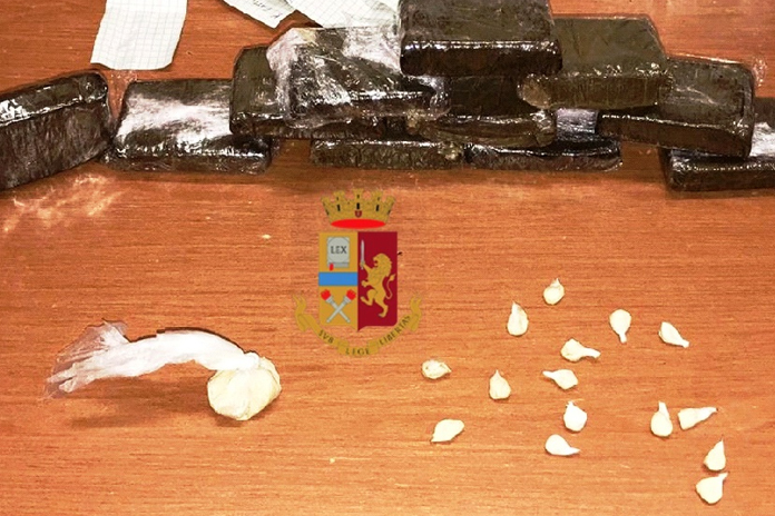 I poliziotti hanno rinvenuto, occultati all’interno di un armadio, 11 panetti di hashish del  peso complessivo di oltre 1 kg che, sulle confezioni, presentavano il marchio che generalmente contraddistingue la provenienza della partita di droga del tutto cancellato, 16 bustine con 12 grammi circa di eroina, diverso materiale per il confezionamento della droga e 130 euro; inoltre, sono state rinvenute 11 stecche di tabacchi lavorati esteri privi del marchio del Monopolio di Stato, per un peso complessivo di 2,2 kg.