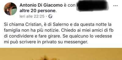 “Si chiama Cristian, è di Salerno e da questa notte la famiglia non ha più notizie. Chiedo ai miei amici di fb di condividere e fare girare. Se qualcuno lo vedesse mi può scrivere in privato su messenger”.