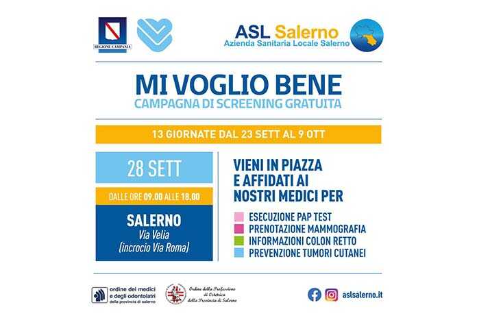 Pertanto lunedì 28 settembre prossimo il camper della campagna “Mi voglio Bene”, con i suoi operatori, sosterà di nuovo a Salerno, in via Velia/incrocio Via Roma dalle ore 9.00 alle ore 18.00.