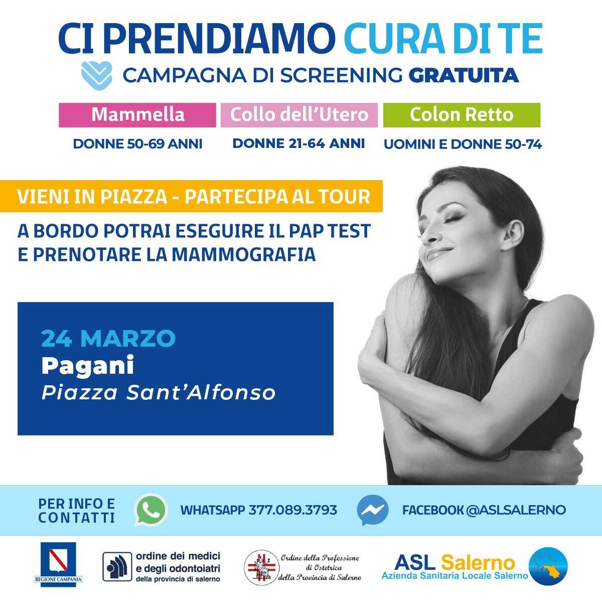 Arriva anche a Pagani il Tour “Ci prendiamo cura di te”, iniziativa di promozione dello screening oncologico promossa dalla Regione Campania e realizzata dall’ASL Salerno in collaborazione con l’Ordine dei Medici e degli Odontoiatri della Provincia di Salerno e l’Ordine della Professione di Ostetrica della Provincia di Salerno con il supporto dell’Amministrazione guidata dal Sindaco Salvatore Bottone.