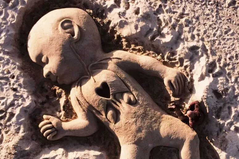 Un gigantesco neonato con un cuoricino stilizzato sul petto domina la spiaggia di Platamona, a Sassari. È la nuova scultura di sabbia realizzata dall’artista sardo Nicola Urru, dedicata al piccolo Domenico, il bimbo morto sabato scorso dopo un trapianto di cuore due mesi fa.