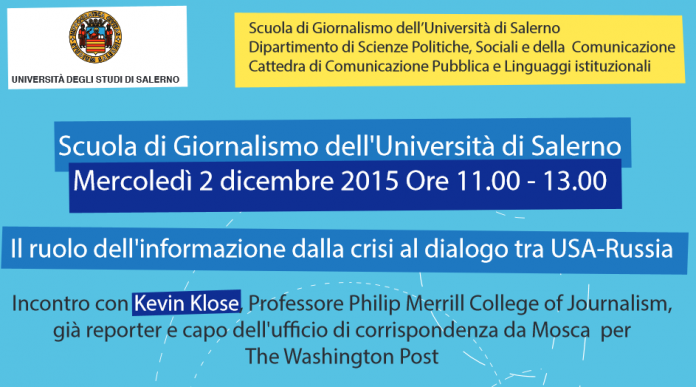 Grande evento per gli studenti di Fisciano. Alla Scuola di Giornalismo dell’Università di Salerno mercoledì 2 dicembre, ore 11.00 – 13.00, ci sarà l’incontro con Kevin Klose, professore Philip Merrill College of Journalism, già reporter e capo dell’ufficio di corrispondenza da Mosca per The Washington Post. Tema di discussione è il ruolo dell’informazione dalla crisi al dialogo tra USA – Russia.