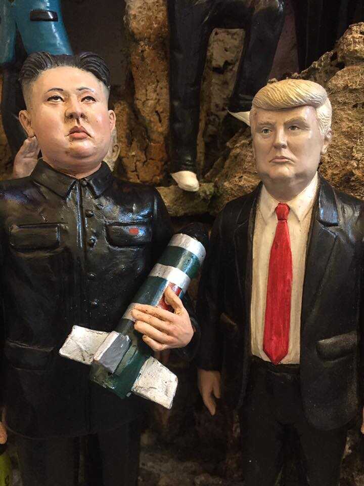 Il mondo teme e fa gli scongiuri davanti all’ennesimo dittatore pazzo. A Napoli, però, si cerca di prenderla con un sorriso. Il dittatore coreano e il presidente degli Stati Uniti. Dai bagliori di guerra alla ipotesi di un ‘incontro’: almeno sul presepe napoletano. L’artista napoletano Marco Ferrigno ha realizzato nella sua bottega di via San Gregorio Armeno, la strada dei presepi di Napoli conosciuta in tutto il mondo, la statuetta dei due grandi rivali, Kim Jong-un e Trump. Che si incontrano ma i cui due sguardi non si incrociano affatto. Nessuna stretta di mano. E con il dittatore coreano che, nonostante la presenza sul presepe, tiene ben stretto un missile. Creatività, al solito, tutta napoletana, con sfondo eduardiano. Speriamo che Kim non s’offenda: ha i mezzi per far esplodere il presepe.