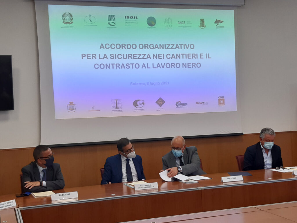 professionali di Ingegneri, Architetti e Geometri, Organizzazioni sindacali di categoria Feneal Uil, Filca Cisl, Fillea-Cgil e, per adesione, Questura, Comando provinciale dei Carabinieri e Comando provinciale della Guardia di Finanza di Salerno.