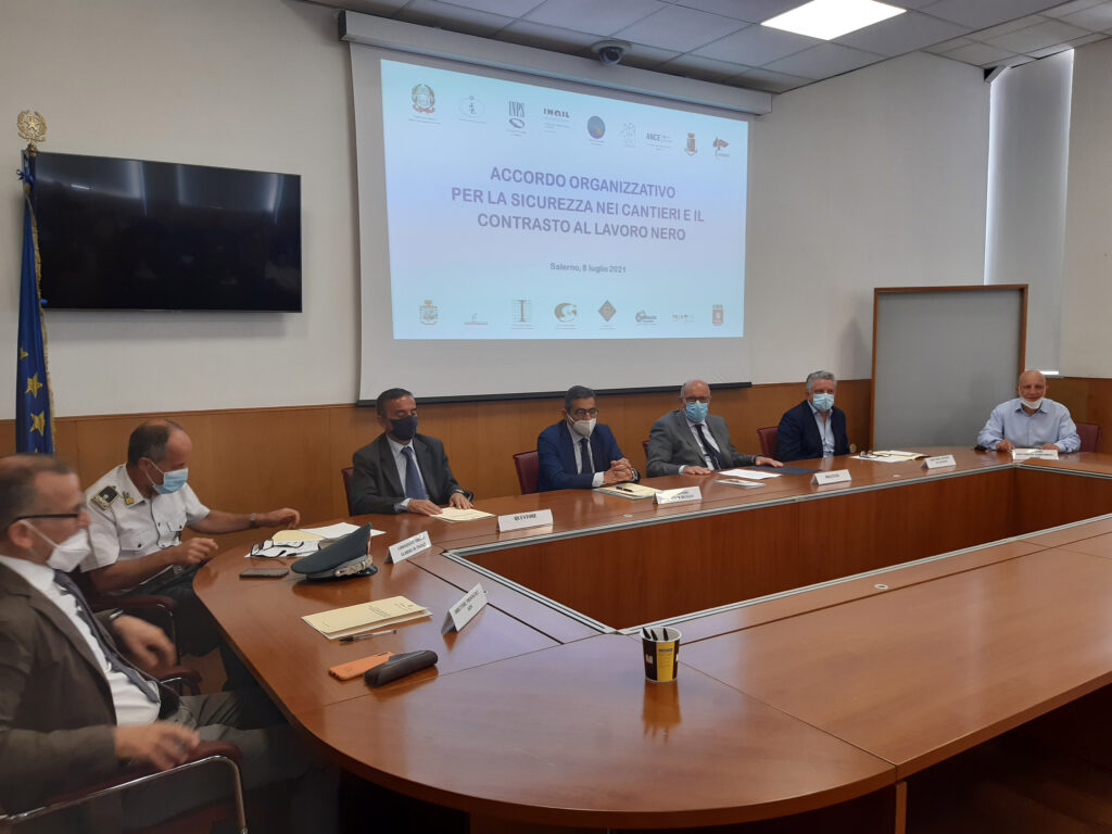Sicurezza nei cantieri e contrasto al lavoro nero al centro di un “Accordo organizzativo” sottoscritto stamane dal Prefetto Francesco Russo, presso il Palazzo del Governo, con i rappresentanti di Ispettorato Territoriale del Lavoro, Azienda Sanitaria Locale, Direzioni Provinciali di INPS e INAIL, Associazione Costruttori Edili di Salerno (ANCE), ANCI Campania, Cassa Edile Salernitana, Ordini