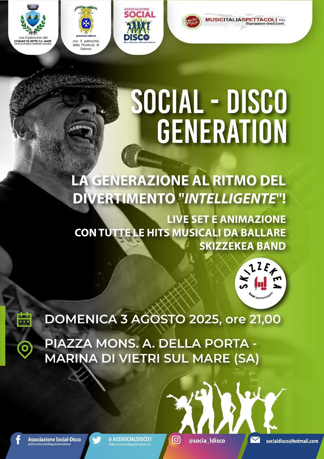 E sarà proprio la musica dal vivo, come sempre, uno dei punti forti della serata. A scaldare la piazza sarà la band Skizzekea, tra le più apprezzate della scena campana, con un repertorio pensato per coinvolgere il pubblico di tutte le età. Non mancheranno momenti di animazione, il lancio dei gadget ufficiali dell’associazione e un set musicale con le hits più amate del momento, a sottolineare la vocazione inclusiva dell’evento.Dopo le edizioni del 2017 e 2022, torna dunque a Vietri sul Mare, prima perla della Costiera Amalfitana, un’iniziativa che ha saputo distinguersi per il suo linguaggio giovane ma profondo, capace di parlare a tutti, portando in piazza un divertimento che fa bene e che fa pensare.Una discoteca sì, ma di quelle che lasciano il segno.