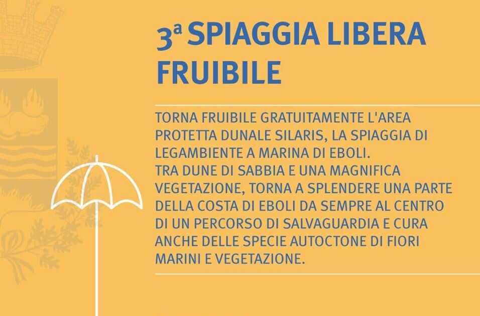 Sono tre le spiagge libere fruibili gratuitamente a Marina di Eboli. A quella di Casina Rossa e a quella di via Carabelli si aggiunge l’Area Protetta Dunale Silaris, la spiaggia di Legambiente. Ingressi contingentati per una capienza complessiva pari ad oltre 2.500 persone.