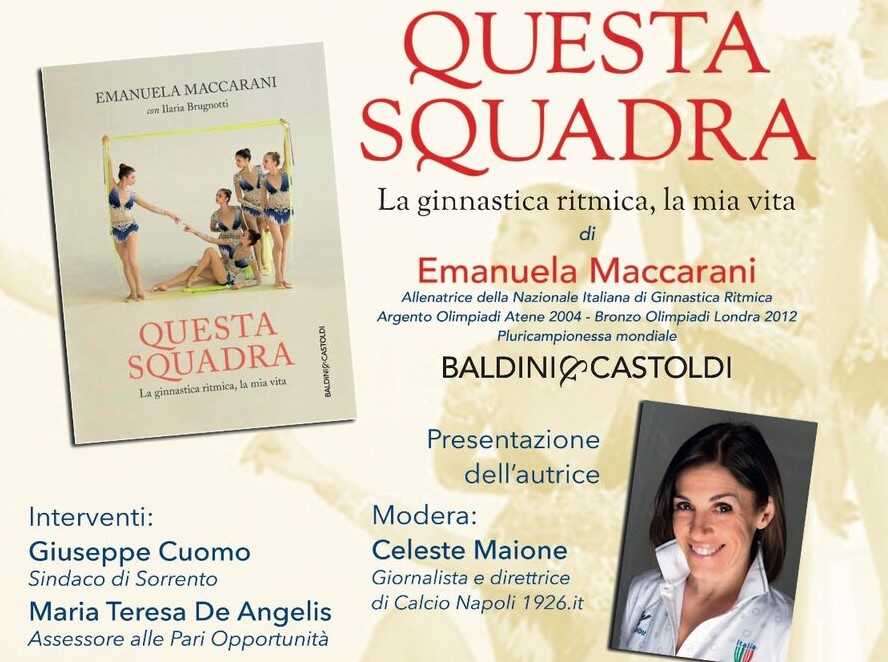 Giovedì 29 dicembre alle ore 17, nella sala consiliare del Comune di Sorrento, si terrà la presentazione del libro “Questa squadra. La ginnastica ritmica, la mia vita”, scritto da Emanuela Maccarani con Ilaria Brugnotti ed edito da Baldini&Castoldi. Oltre alla Maccarani, da vent’anni allenatrice della squadra nazionale di Ginnastica Ritmica, pluricampionessa mondiale, medaglia d’argento alle Olimpiadi di Atene 2004, medaglia di bronzo alle Olimpiadi di Londra 2012 e quarta alle ultime Olimpiadi di Rio interverranno, moderati da Celeste Maione, giornalista e direttrice di Calcio Napoli 1926, il sindaco di Sorrento, Giuseppe Cuomo e l’assessore alle Pari Opportunità, Maria Teresa De Angelis. L’incontro è organizzato dal Comune di Sorrento in collaborazione con l’Asd Ginnastica Sorrento.