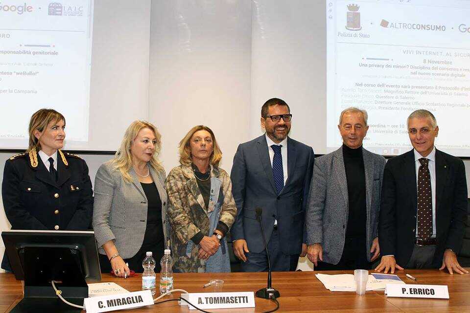 Il tema affrontato nel corso della tappa salernitana è stato: “Una privacy dei minori? Disciplina del consenso e responsabilità genitoriale nel nuovo scenario digitale”, con l’introduzione e il coordinamento di Salvatore Sica (Università di Salerno – IAIC). Nel corso dell’evento è stato sottoscritto il Protocollo d’Intesa “weBullo!”, teso a a diffondere la cultura della legalità in genere e a promuovere un uso sicuro e consapevole della rete attraverso attività di sensibilizzazione e di prevenzione del cyberbullismo.