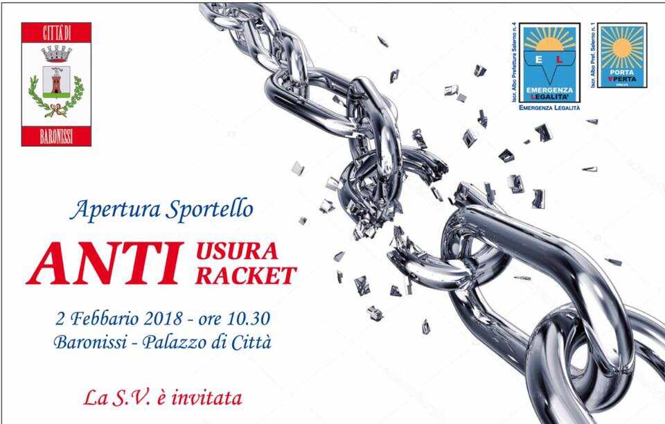 Sarà inaugurato venerdì 2 febbraio alle ore 10.30 lo “sportello antiusura e antiracket” a Baronissi, un ulteriore presidio di legalità al servizio di cittadini e imprese. Lo sportello sarà gestito da personalità esperte e professionali. “Nostro obiettivo – afferma Valiante – è prevenire e contrastare un fenomeno che, nella Valle dell’Irno, è in aumento agevolato anche dalla crisi economica che si ripercuote sui lavoratori, sulle famiglie, sulle imprese. Il coinvolgimento interesserà associazioni, scuola, forze dell’ordine. I cittadini sono invitati al taglio del nastro”.