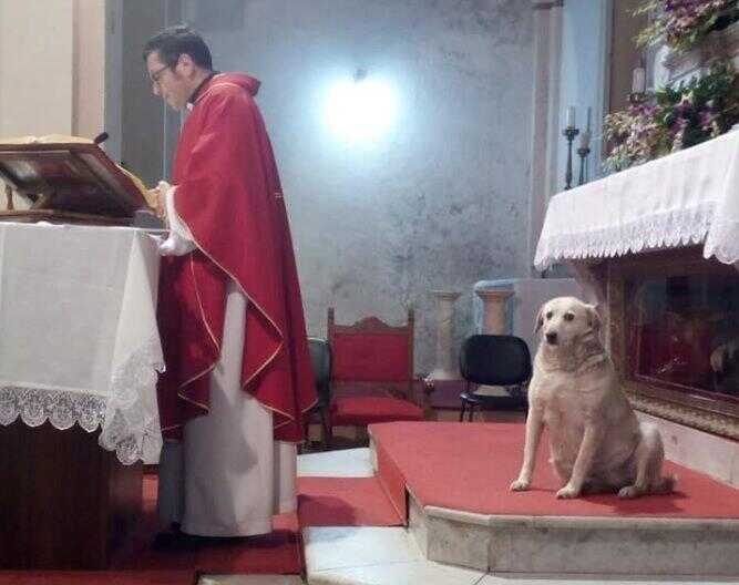 “Il cane è un gentiluomo”, scrive Mark Twain. “È sincero, non mente, non inganna, non tradisce, è generoso, è altruista, ha fiducia”. Ma c’è di più. Il grande scrittore Victor Hugo – come tutti coloro che hanno un cane – si chiede: “Se guardi negli occhi il tuo cane, come puoi ancora dubitare che non abbia un’anima?”. La Chiesa riconosce l’anima del cane, anzi a volta pure la presenza in corpo sull’altare, da chierichetto silenzioso e molto fedele. Tutte le domeniche sta fermo immobile accanto all’altare mentre don Giuseppe Rizzo, parroco della chiesa patronale di San Folco Pellegrino, a Santopadre, provincia di Frosinone, dice la messa. Si tratta di un cagnolino color crema che ancora non ha un nome, ma che, per tutti i parrocchiani, ormai è diventato una mascotte, una presenza amica. Il primo ingresso in chiesa qualche mese fa in occasione della festa del Santo Patrono. Impaurito dai fuochi d’artificio e dal rumore della musica, il cane si è intrufolato nel luogo di culto e da quel giorno il parroco lo ha sempre accolto sull’altare, di fianco a lui.