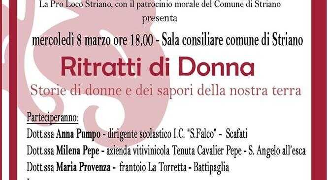 Un evento per celebrare la donna imprenditrice, per raccontare storie di vita, di donne e di passione. La Pro Loco Striano, con il patrocinio del Comune, presenta “Ritratti di Donna – Storie di donne e dei sapori della nostra terra”. All’incontro parteciperanno la dottoressa Anna Pumpo – dirigente scolastico I.C. “S.Falco” – Scafati, la dottoressa Milena Pepe – azienda vitivinicola Tenuta Cavalier Pepe – S. Angelo all’esca, la dottoressa Maria Provenza – frantoio La Torretta – Battipaglia. Interverranno all’incontro il Sindaco Aristide Rendina e l’Assessore alla Cultura Rosa Rega. Moderatrice dell’evento sarà la dottoressa Laura Ferrara. Non mancherà una degustazione dei prodotti offerti dalle relatrici.