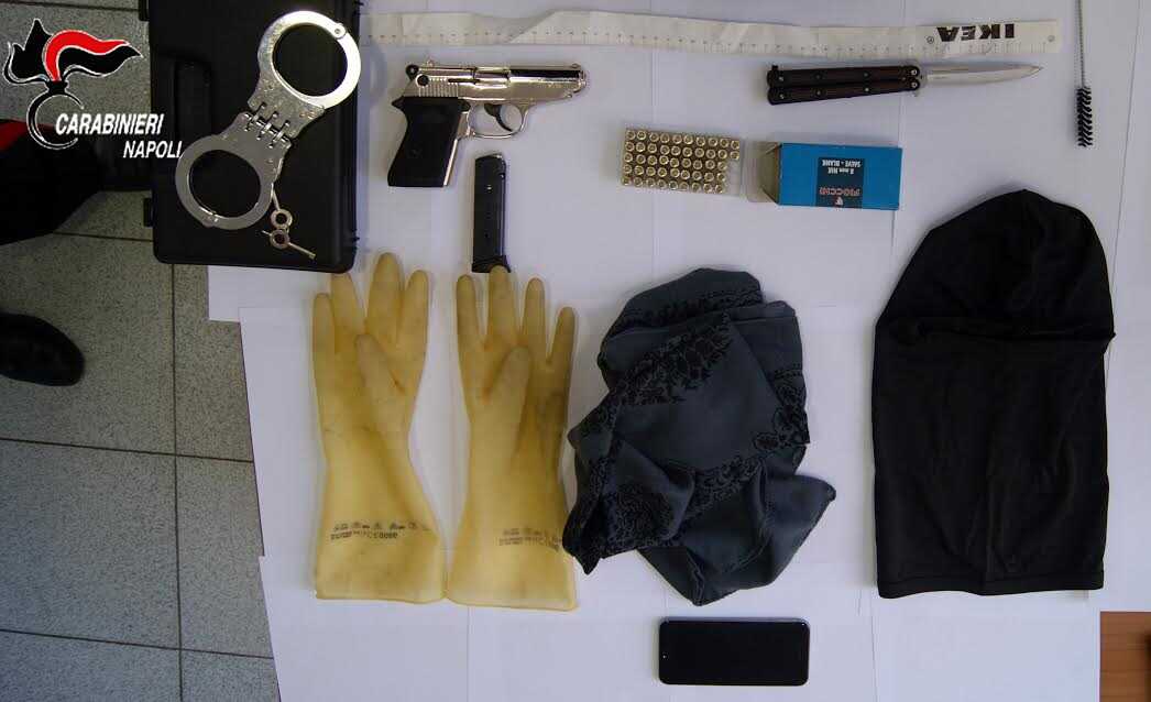 Inutile il tentativo del giovane di darsi alla fuga e di disfarsi di uno zainetto: i carabinieri lo hanno immobilizzato, recuperando lo zaino, al cui interno erano custoditi una una semiautomatica a salve con 3 cartucce nel caricatore, un coltello a serramanico, un passamontagna di lana, una scatola con circa 50 cartucce a salve, manette e guanti.