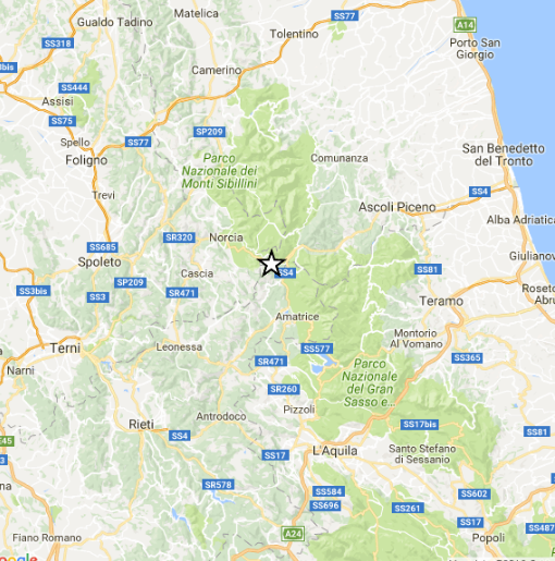 Una violenta scossa di terremoto, di magnitudo 6, è stata registrata alle 3:36, con epicentro vicino Accumoli, in provincia di Rieti, e con ipocentro a soli 4 chilometri di profondità. Crolli di edifici sono segnalati ad Accumoli e Amatrice. “Metà paese non c’è più, la gente è sotto le macerie”, ha detto a SkyTg24 il sindaco di Amatrice, Pirozzi, dove anche “le strade di accesso sono bloccate”. Su una c’è una frana e un’altra ha un ponte che sta per crollare. La gente si è riunita negli impianti sportivi, si è senza corrente. Nel Comune di Accumoli c’è almeno una vittima, e una famiglia di quattro persone – due bambini piccoli e i loro genitori – è sotto le macerie e non da segni di vita. Lo ha detto a RaiNews24 il sindaco di Accumoli, Stefano Petrucci.