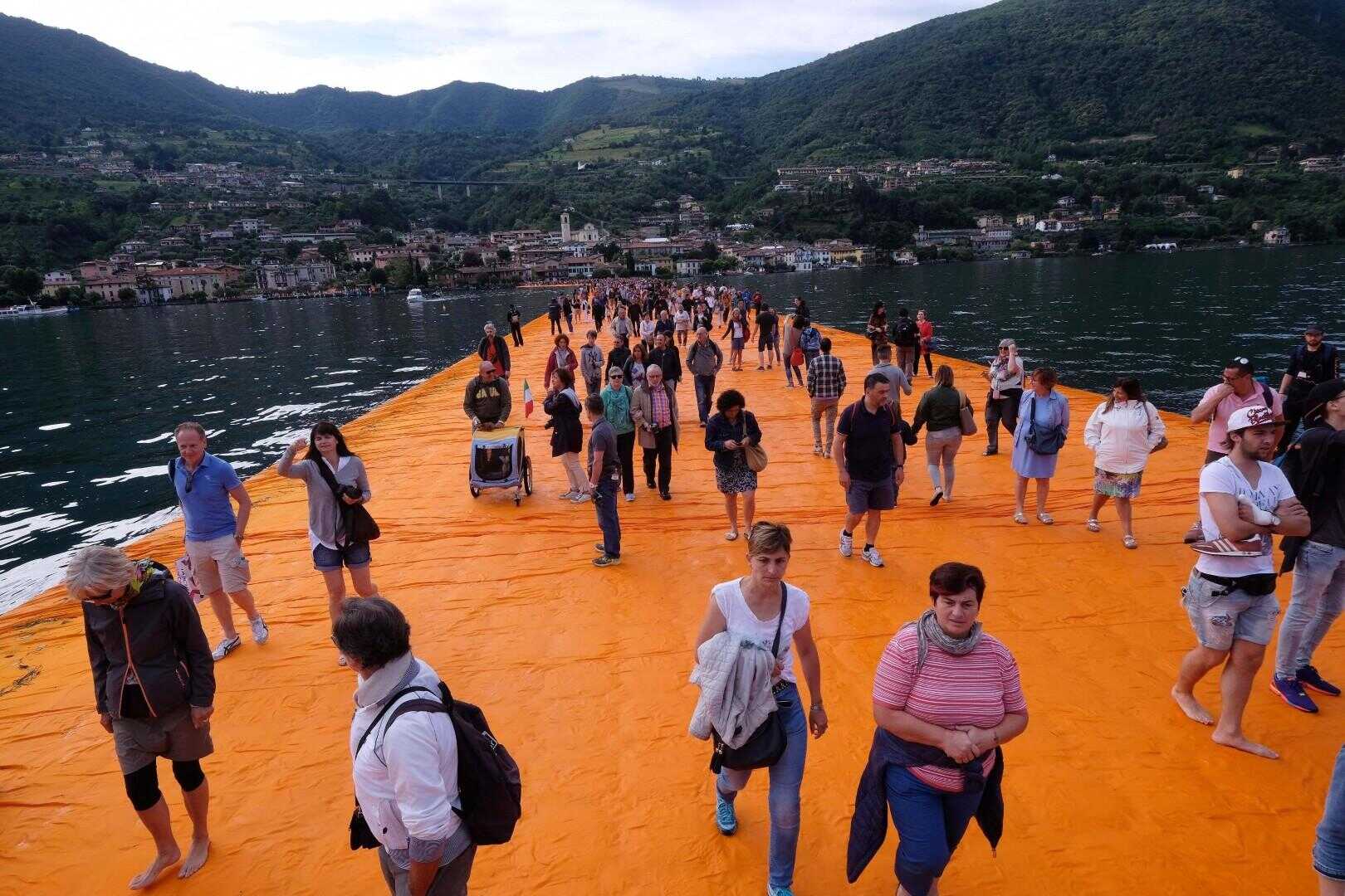 È diventata un’attrazione turistica in piena regola “The Floating Piers”, la passerella ideata dall’artista bulgaro Christo, sul lago d’Iseo. Migliaia di persone hanno preso d’assalto l’opera – lunga 4,5 chilometri, aperta gratuitamente 24 ore su 24 fino al 3 luglio – per provare il brivido di “camminare sull’acqua”. Si sono registrate infatti circa 55mila visitatori nel primo giorno. La passerella collega Sulzano a Monte Isola e permette di camminare sulle acque della sponda bresciana del lago di Iseo. Sono attesi un milione di turisti in due settimane.