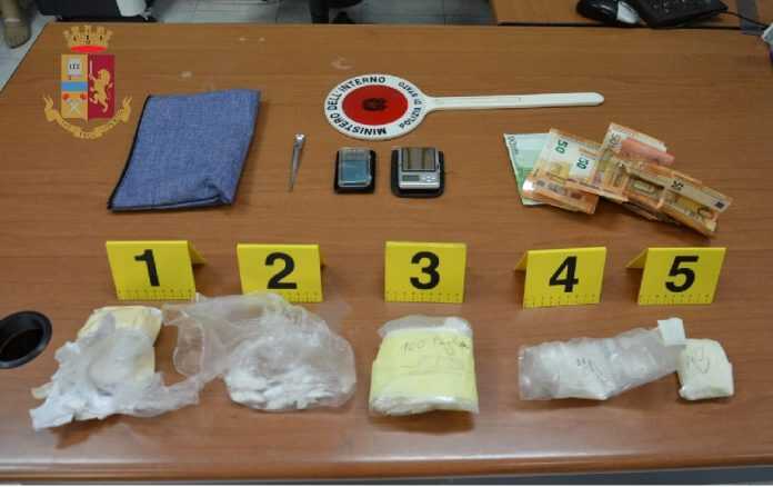 Nell’abitazione,  il cane “Kira” ha fiutato e scoperto, nascosti in un’anta di una finestra, due rotoli di banconote del valore complessivo di 1.720 euro e, all’interno dei cassetti della cucina, un borsello contenente circa 165 grammi di cocaina, due bilancini ed un cucchiaino.