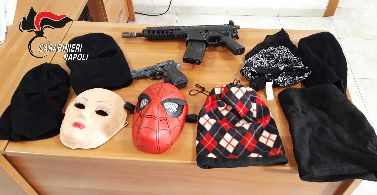 Una pistola mitragliatrice giocattolo in metallo e una pistola a salve (entrambe senza tappo rosso), 2 maschere (una dell’uomo ragno e una di donna), 2 passamontagna, scarpe e tute. Questo è quanto hanno rinvenuto e sequestrato i carabinieri della compagnia di Torre Annunziata in un palazzo abbandonato di piazza giovanni xxiii, alle spalle del palazzo “Fienga”, storica roccaforte del clan Gionta.