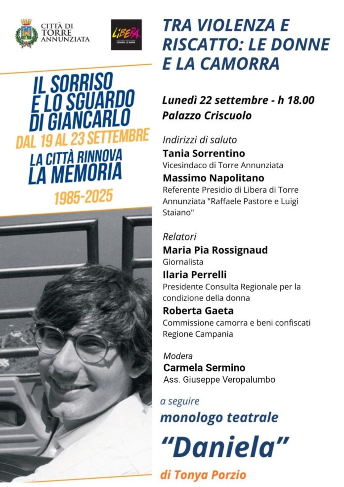 L’evento, organizzato dal presidio di Libera di Torre Annunziata “Raffaele Pastore e Luigi Staiano”, vedrà la partecipazione di relatori di spicco, tra cui Maria Pia Rossignaud, giornalista e sorella di Daniela, la fidanzata di Giancarlo Siani, il giovane giornalista ucciso dalla camorra. Insieme a lei interverranno Ilaria Perrelli, Presidente della Consulta regionale per la condizione della donna, e Roberta Gaeta, Consigliera regionale della commissione camorra e beni confiscati. L’incontro sarà moderato da Carmela Sermino, Ass. Giuseppe Veropalumbo. A conclusione del convegno, sarà presentato il monologo teatrale “Daniela” di Tonya Porzio, un ulteriore momento di riflessione e sensibilizzazione su tematiche di grande attualità. L’evento è aperto a tutti e rappresenta un’opportunità per approfondire il complesso rapporto tra donne e camorra.