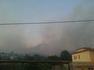 Forte l’apprensione tra i cittadini: l’aria è acre, una cappa di fumo sovrasta le abitazioni, su cui ha preso a piovere cenere.