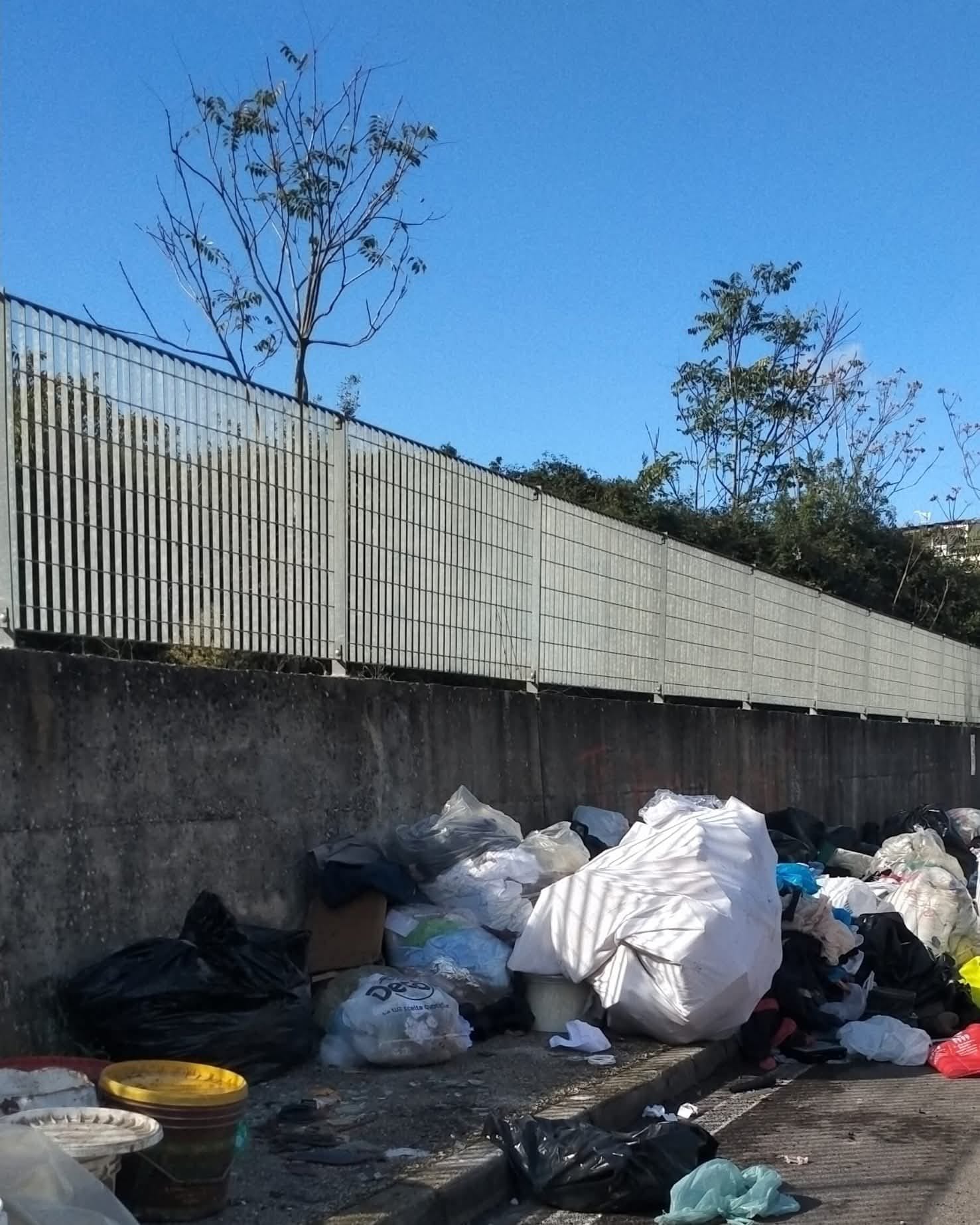 Le immagini prodotte dalla giovane cittadina mostrano un marciapiede completamente invaso da cumuli di rifiuti di ogni genere, inclusi ingombranti, sacchetti neri e materiali edili. La situazione è aggravata dalle evidenti tracce di incendi frequenti che, oltre al rischio immediato, aumentano l’inquinamento atmosferico e il pericolo per la salute degli abitanti.