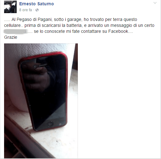 Chi perde un oggetto di valore non sempre riesce a recuperarlo. Ed è costretto, il più delle volte, a riacquistarlo o doverne fare definitivamente a meno. Fortunata, invece, è stata la proprietaria di un iPhone 5 trovato nel parcheggio del Pegaso. A recuperarlo, il paganese Ernesto Saturno, esponente tra l’altro di spazio aperto. L’uomo, presente al pegaso intorno alle 17 di oggi pomeriggio, si è accorto della presenza del telefono cellulare all’interno del parcheggio. Ha provato a chiamare ma non vi è riuscito, la batteria era quasi del tutto esaurita. Da lì, la foto su Facebook, con la richiesta di aiuto di rintracciare l’eventuale proprietario. Il social si è mobilitato: a Saturno è stato prestato un caricabatterie compatibile con il prodotto Apple e, dopo aver caricato un po’ la batteria, il paganese ha chiamato. A risponderlo, una voce femminile. Una donna che, dopo poco, ha riavuto il suo cellulare sano e salvo.