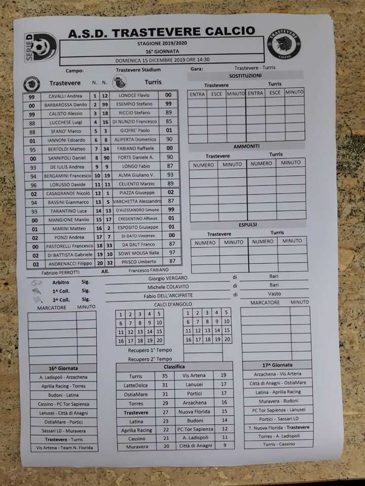 Subito pericolosi gli ospiti nella ripresa, tiro di Riccio diretto all’incrocio disinnescato da Cavalli con un grande intervento. Sul calcio d’angolo seguente ancora Riccio trova stavolta la via del gol, ma l’arbitro annulla per un fallo di Forte. Poche emozioni nel secondo tempo, tiene bene il campo il Trastevere ma è ancora la Turris a provarci con un tiro di Fabiano lontano dal bersaglio. Al 68′ gli ospiti la sbloccano nell’unico modo possibile, su calcio piazzato. Aliperta mette una bella palla in area e Di Nunzio di testa porta in vantaggio i corallini, spezzata l’arcigna difesa del Trastevere. Provano a reagire i padroni di casa, tentativo di Sfanò smorzato in calcio d’angolo, poi all’81’ chiude i conti la Turris con il gol del due a zero realizzato da Sowe, l’attaccante neo entrato chiude al meglio un contropiede.