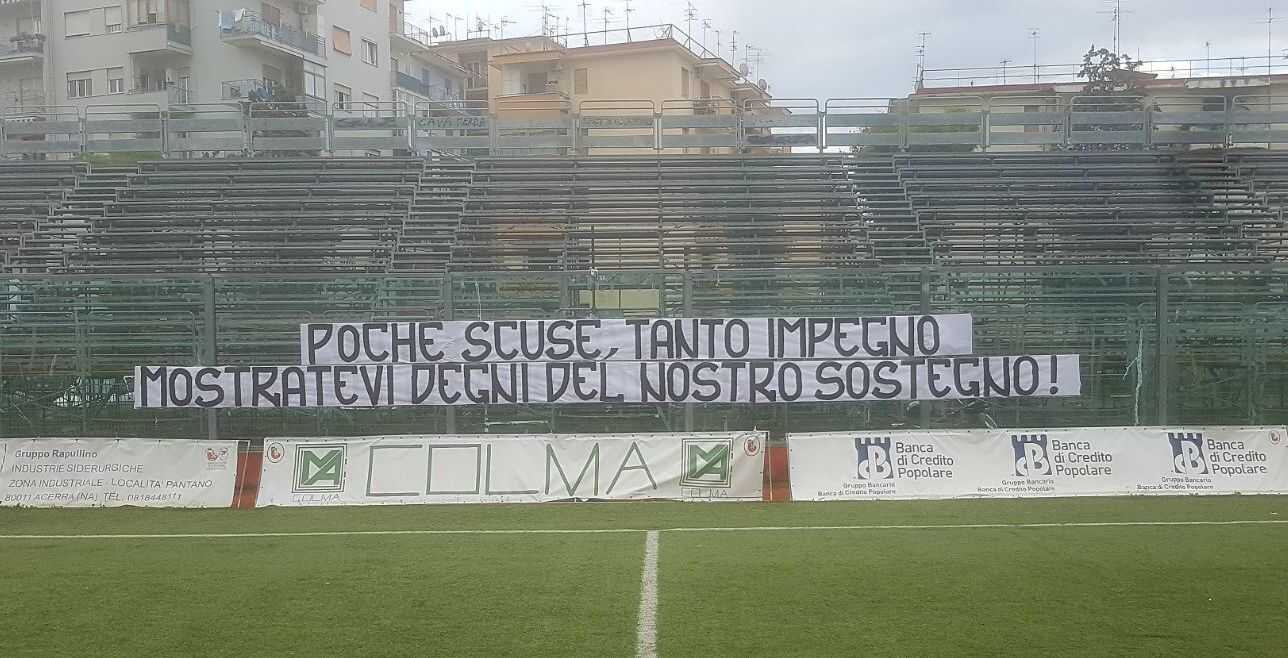 Uno striscione ad accogliere l’ingresso in campo dei ragazzi di Carannante, attesi dalla probante sfida dello Iacovone. “Poche scuse, tanto impegno. Mostratevi degni del nostro sostegno”.