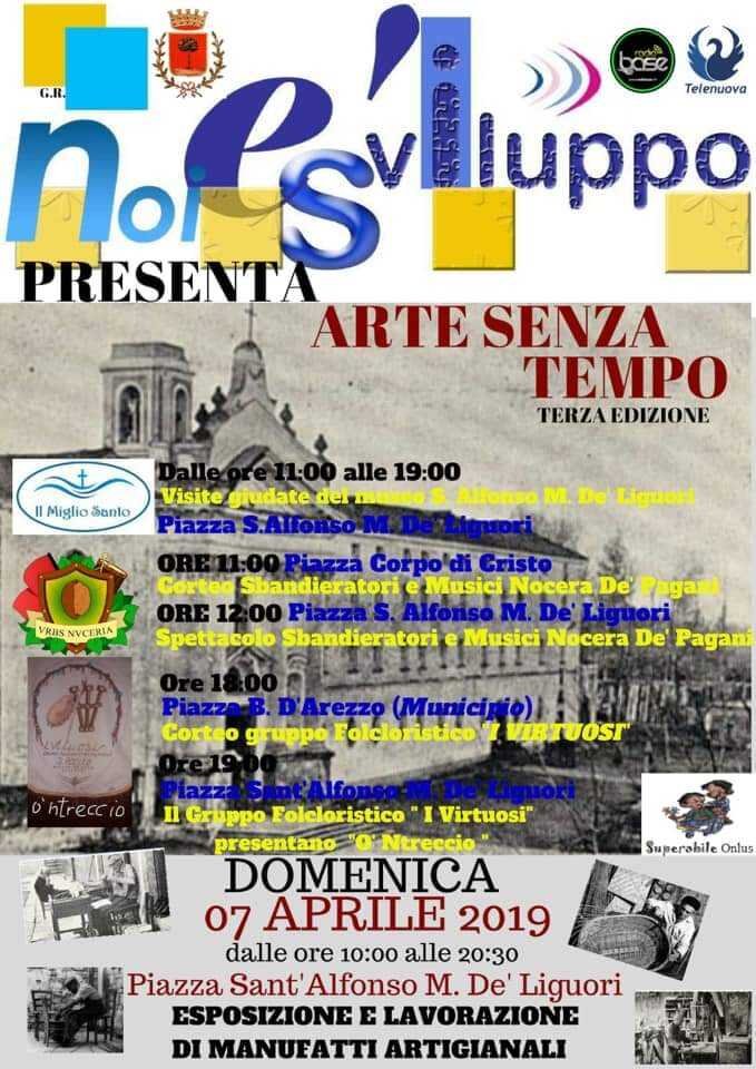 L’ associazione NoieSviluppo il 7 aprile 2019 ritorna con l’evento: “Arte senza tempo”. Per la terza edizione si è pensato di fare le cose in grande, aggiungendo tante belle novità, con stand espositivi, visite guidate gratuite al Museo di S. Alfonso M. De Liguori, e ben due gruppi d’intrattenimento.