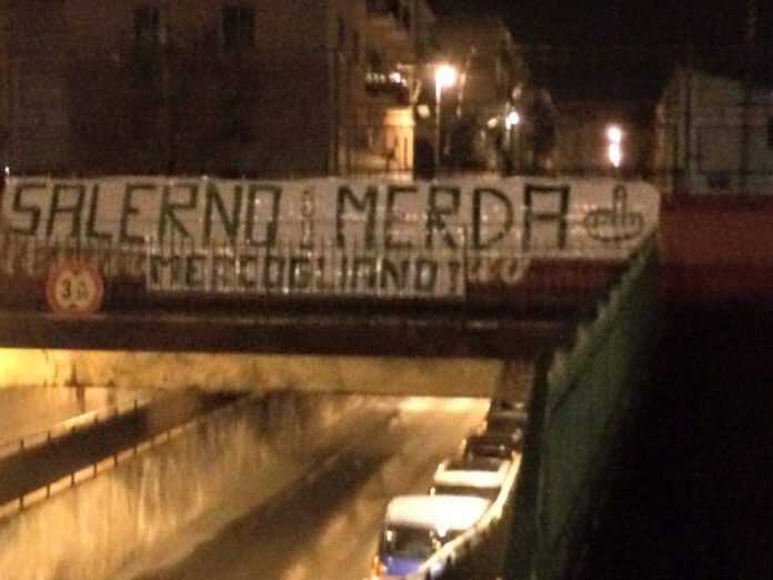Un “raid” notturno per affiggere uno striscione offensivo contro la tifoseria di casa. Salerno, zona via Dalmazia: quel sottopasso è da sempre un punto nevralgico per le “comunicazioni pubbliche” dei supporters della Salernitana. Proprio lì, nella notte, ignoti hanno affisso uno striscione (nella foto) che reca in calce la “firma” Mercogliano.