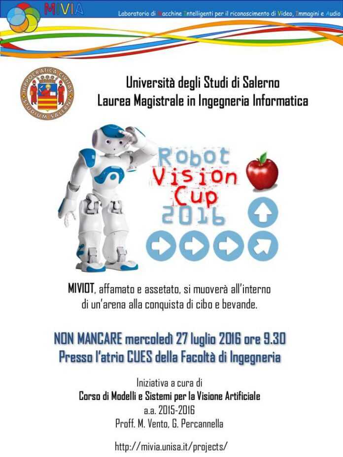 Al via la sesta edizione della Robot Vision Cup. La competizione è parte integrante della prova finale del corso di Modelli e Sistemi per la Visione Artificiale (anno accademico 2015-2016) della Laurea Magistrale in Ingegneria Informatica dell’Università degli Studi di Salerno (a cura dei prof. Mario Vento e Gennaro Percannella).
