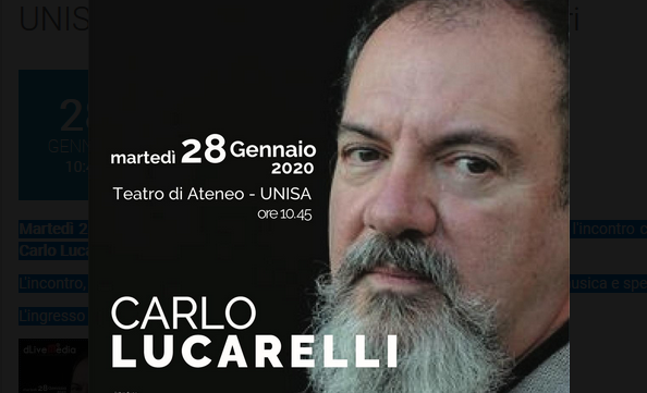 Martedì 28 gennaio 2020, a partire dalle ore 10.45, il Teatro di Ateneo ospiterà l’incontro con lo scrittore, sceneggiatore e conduttore Carlo Lucarelli. L’incontro, aperto a tutti gli interessati, è promosso nell’ambito della rassegna di musica e spettacolo DLIVEMEDIA. L’ingresso è libero fino ad esaurimento posti.