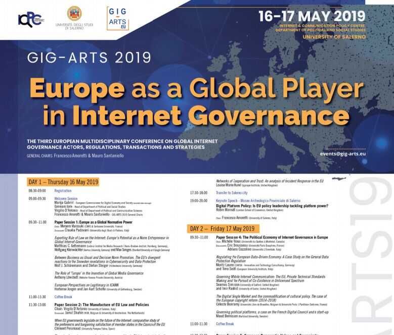 L’evento, organizzato dall’Internet & Communication Policy Centre del Dipartimento di Studi Politici e Sociali, si terrà nell’Aula De Rosa a partire dalle 8:30 di giovedì 16 maggio, e sarà aperto da un video messaggio della Commissaria UE per l’Economia e la Società Digitali, Marija Gabriel. Alle 14:30 le presentazioni accademiche, coordinate dai General Chairs Francesco Amoretti e Mauro Santaniello, docenti dell’Università di Salerno, lasceranno spazio a una tavola rotonda sul tema della regolamentazione di Internet, cui parteciperanno il Senatore Giacomo Stucchi, ex Presidente del COPASIR, Guy Berger, Direttore della Divisione Freedom of Expression and Media Development dell’UNESCO, il Commissario per le Infrastrutture e le Reti di AGCOM, prof. Antonio Nicita, il Direttore dello Stakeholder Engagement Europe di ICANN, Andrea Beccalli, Max Senges di Google Germania, e l’avvocato Piefrancesco Fasano di MFSD Domain Name Dispute Resolution Centre. Le presentazioni scientifiche continueranno fino alle 19:00, quando il convegno si sposterà nei locali del Museo Archeologico Provinciale di Salerno, per il keynote speech della professoressa Robin Mansell della London School of Economics (LSE).