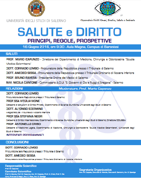Il 16 giugno 2016 si terrà presso l’Aula Magna, Campus di Baronissi il convegno “Salute e Diritto: principi, regole e prospettive”. L’incontro verterà sulle principali tematiche di carattere etico, sociale e giudiziario connesse alla professione medica e dell’operatore sanitario, che soprattutto al giorno d’oggi non può esimersi dal considerare tali aspetti nella quotidianità del suo operato. Interverranno personalità del mondo della Giustizia e della Sanità.