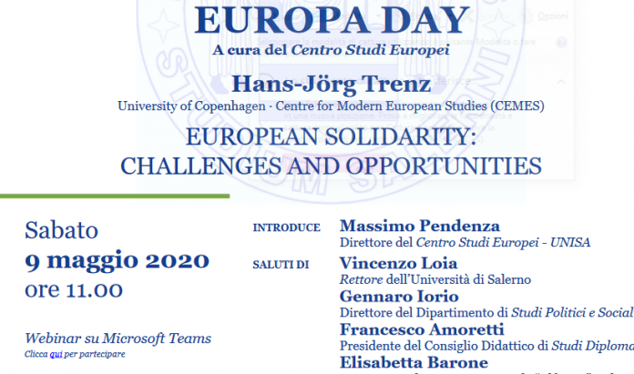 Domani, alle ore 11.00, il Centro Studi Europei (CSE) organizza la sesta edizione dell’Europa Day, quest’anno in modalità online su Piattaforma Microsoft Teams (il link per partecipare è sulla locandina di seguito disponibile). Ospite di questa edizione è il prof. Hans-Jörg Trenz (University of Copenhagen · Centre for Modern European Studies – CEMES), che terrà una Lectio Magistralis dal titolo EUROPEAN SOLIDARITY: CHALLENGES AND OPPORTUNITIES. Introduce i lavori il Direttore del CSE, prof. Massimo Pendenza, cui seguono i saluti di Gennaro Iorio, Direttore del Dipartimento di Studi Politici e Sociali (DiSPS), di Francesco Amoretti, Presidente CD di Studi Diplomatici e Elisabetta Barone, Dirigente scolastico del Liceo Statale Alfano I di Salerno. Interviene l’Europarlamentare Andrea Cozzolino.