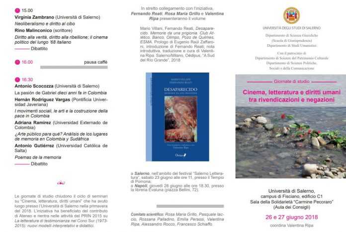 Si prevedono, dopo ogni sessione, momenti di discussione tra tutti i presenti. L’attività, che chiude il ciclo di seminari su “Cinema, letteratura, diritti umani” che ha avuto luogo tra aprile e maggio, si inscrive altresì nelle attività del PRIN 2015 su La letteratura di testimonianza nel Cono Sur (1973-2015): nuovi modelli interpretativi e didattici e sarà affiancata dalle presentazioni, a Salerno il 23 e a Napoli il 28 giugno, dell’edizione italiana del libro Desaparecido. Memorias de un cautiverio, di Mario Villani e Fernando Reati.