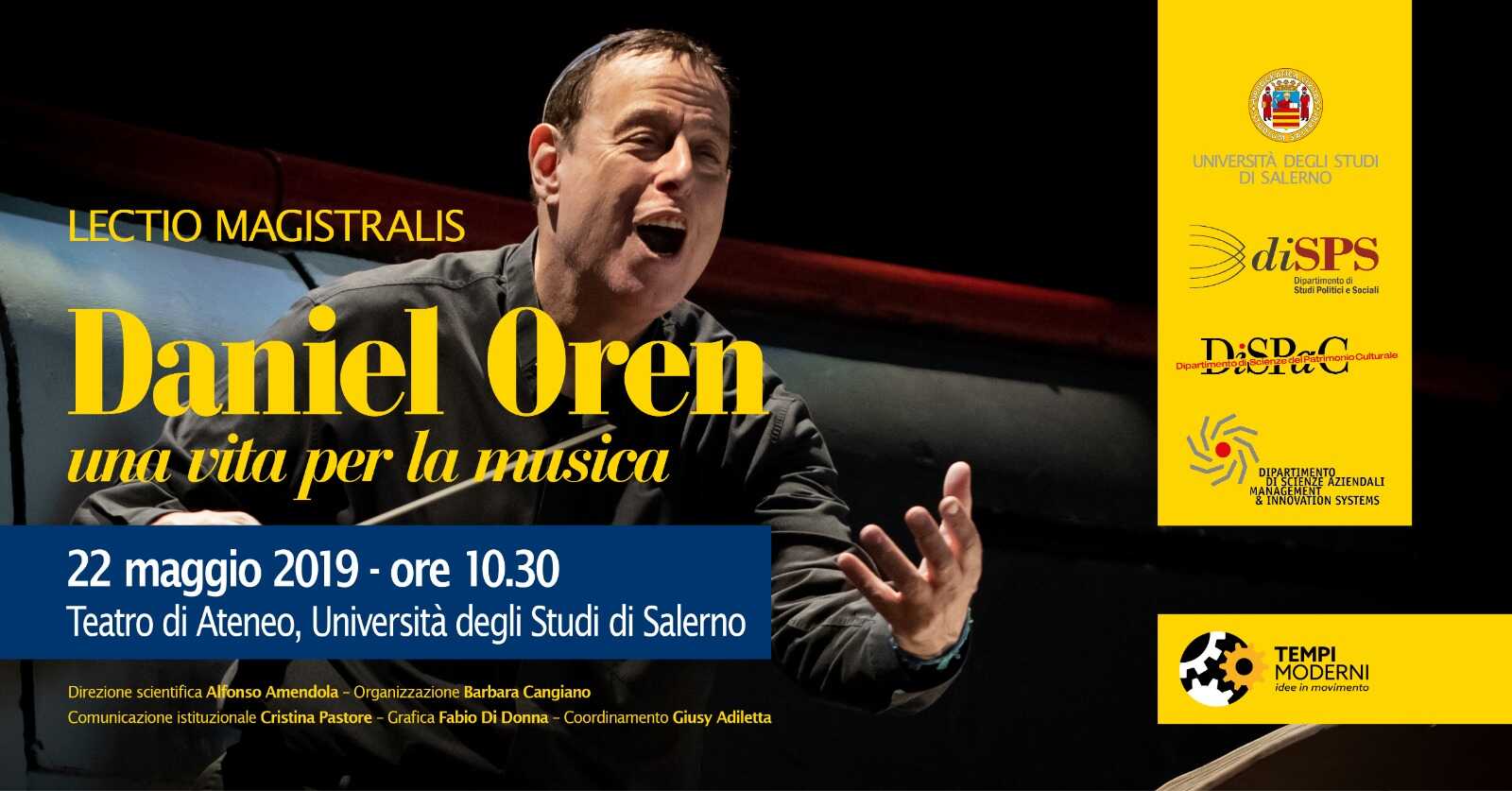 Daniel Oren, direttore musicale dell’Arena di Verona Opera Festival e direttore artistico del Teatro Verdi di Salerno, sarà il protagonista di una lectio magistralis che si terrà mercoledì 22 maggio (ore 10.30) presso il Teatro di Ateneo “Filippo Alison” dell’Università degli studi di Salerno, nell’ambito del ciclo di appuntamenti di Open class, il format pensato dal docente Alfonso Amendola per avvicinare Università e territorio attraverso la presenza di professionisti estranei al mondo accademico.