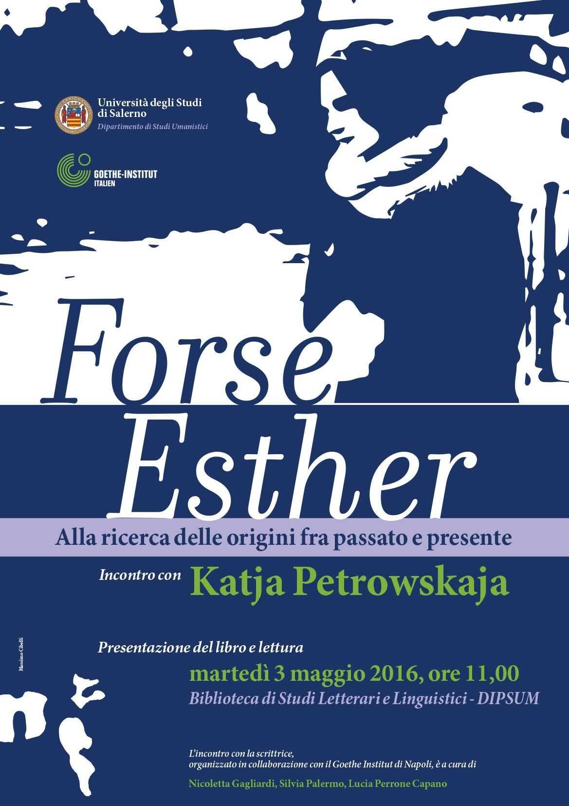 Il 3 maggio, alle ore 11.00 presso la Biblioteca di Studi Letterari e Linguistici – DIPSUM, ci sarà un incontro con con Katja Petrowskaja che presenterà il libro “Forse Esther. Alla ricerca delle origini fra passato e presente”. Nel suo romanzo di esordio “Vielleicht Esther” (Suhrkamp Verlag, 2014; in Italia: “Forse Esther”, Adelphi, 2014), celebrato dalla critica (Premio Ernst Toller e Premio Strega Europeo) e dal pubblico, l’autrice ucraina di adozione berlinese Katja Petrowskaja intraprende un viaggio, insieme reale e metaforico, attraverso i drammi del Novecento, nel tentativo di ricomporre il variopinto mosaico di una famiglia dilaniata dai conflitti del tempo. Il libro racconta lo sterminio degli ebrei a Kiev per mano dei nazionalsocialisti attraverso la storia di Esther, figura ispirata alla bisnonna dell’autrice che nel 1941 fu deportata e assassinata nel massacro di Babij Jar, ed è la tangibile testimonianza di come nell’ autrice e nel testo si coniughino diverse culture: russa, ucraina, tedesca ed ebraica. L’incontro con la scrittrice, organizzato in collaborazione con il Goethe Institut di Napoli, è a cura di Nicoletta Gagliardi, Silvia Palermo, Lucia Perrone Capano.
