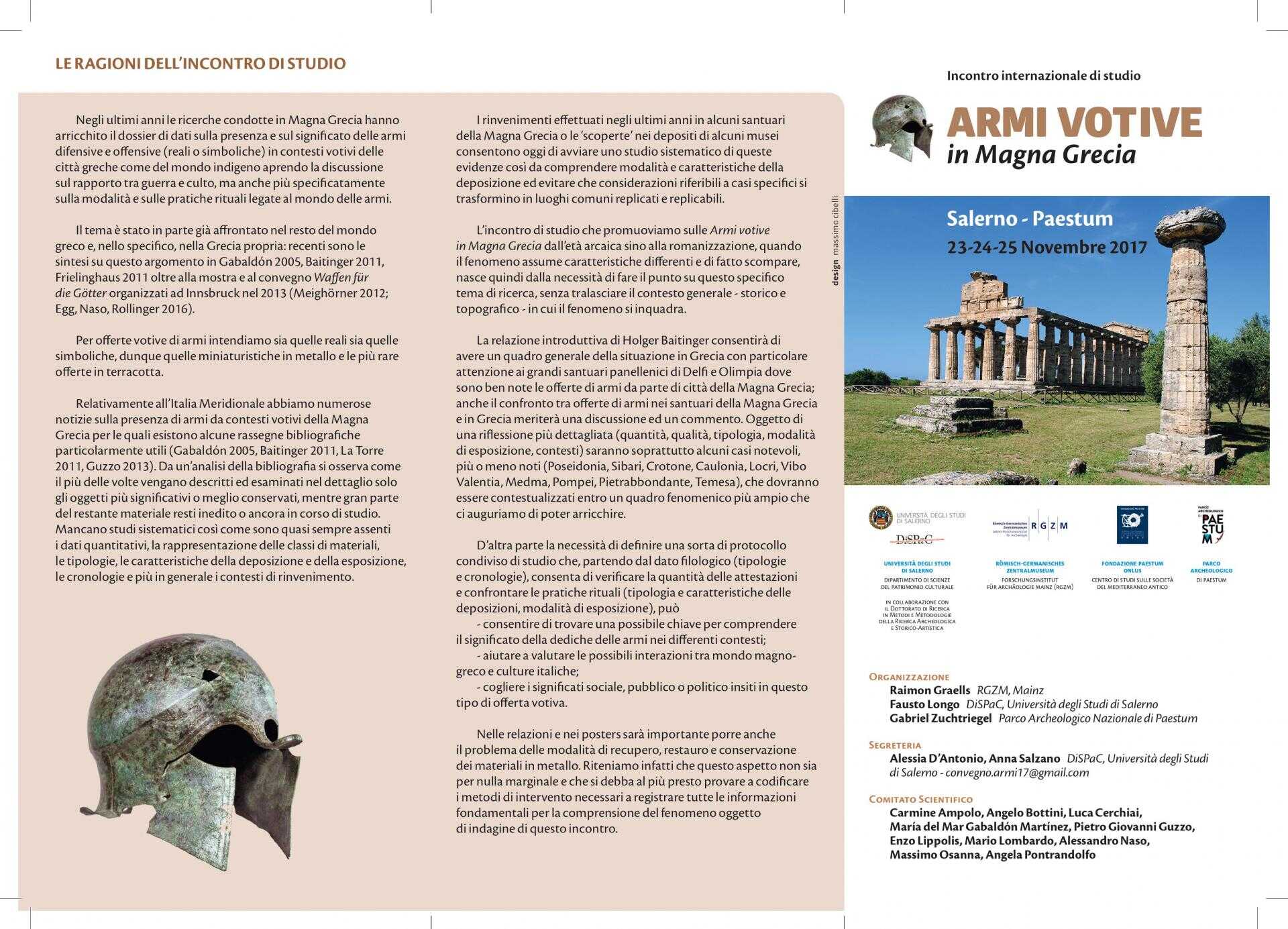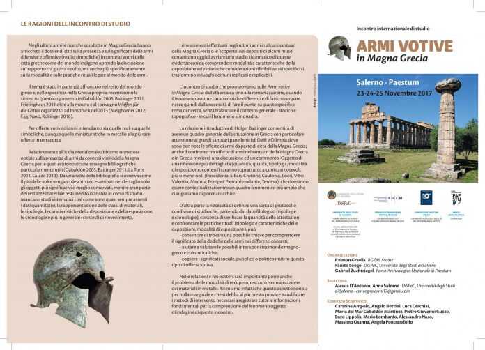 Dal 23 al 25 novembre l’Unisa con il Dipartimento di Scienze del Patrimonio Culturale, il Parco Archeologico di Paestum, in collaborazione con il Museo RGZM e la Fondazione Paestum Onlus, organizzano l’Incontro internazionale di studio dal titolo “Armi votive in Magna Grecia”. L’incontro si svolgerà tra Unisa e Museo Archeologico Nazionale di Paestum. A partire dal 25 novembre, inoltre, sarà inaugurata la Mostra “Le armi di Athena. Il santuario settentrionale di Paestum”, visitabile presso il Parco fino al 31 marzo 2018.