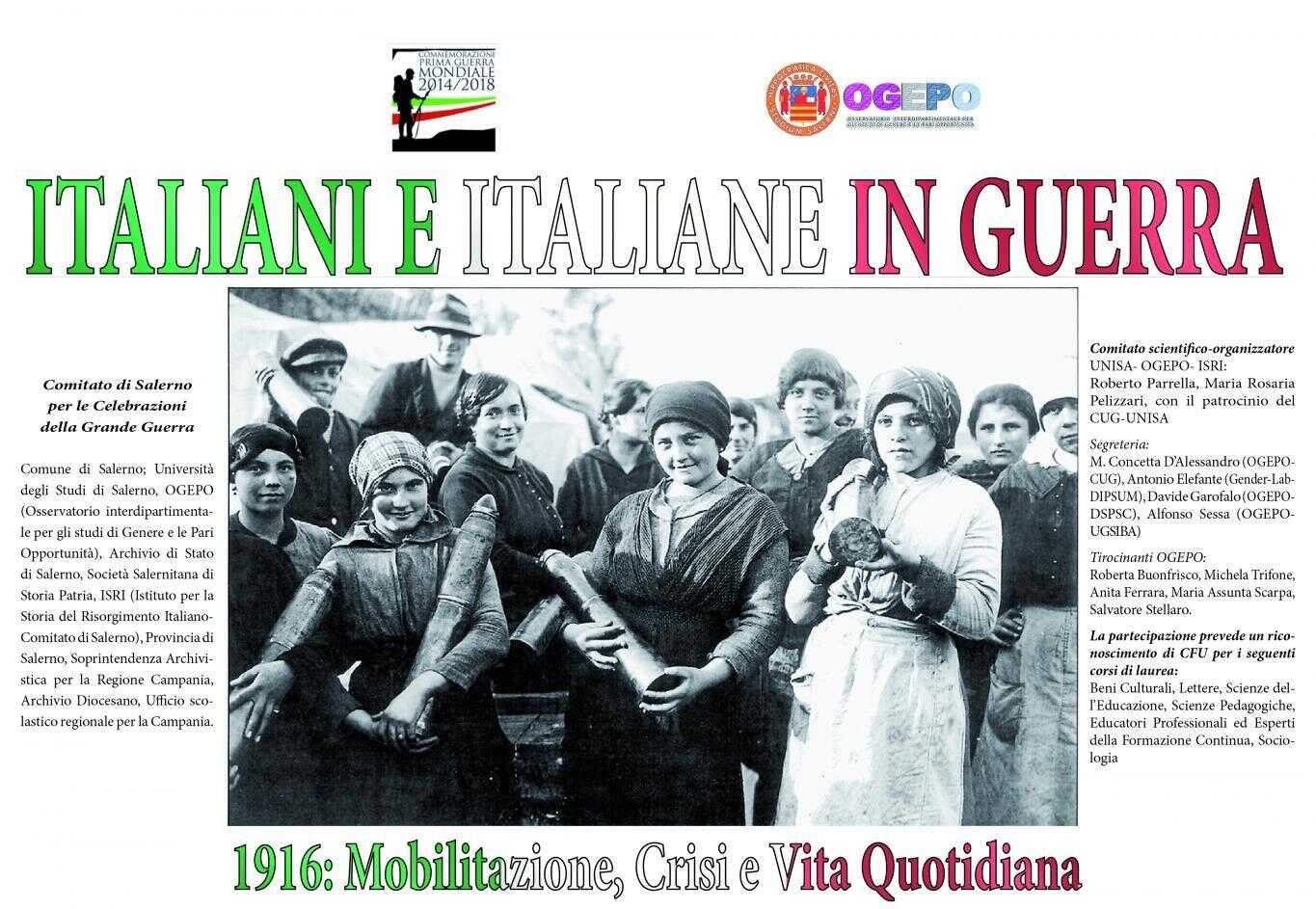 Si terrà mercoledì 9 e giovedì 10 novembre alle 09:30, nell’aula “G. De Rosa” dell’Unisa, un incontro di studio dal titolo: “Italiani e Italiane in guerra. 1916: mobilitazione, crisi e vita quotidiana”. Il convegno si inserisce all’interno delle iniziative promosse dal Comune di Salerno per la celebrazione del Centenario della Prima Guerra Mondiale ed è organizzato dall’Ogepo, in collaborazione con l’ISRI e con il patrocinio del CUG/UNISA. Durante l’incontro interverranno vari studiosi che proporranno una riflessione sulla realtà economica, sociale, culturale degli italiani durante la Grande Guerra.