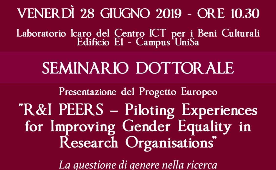 Si svolgerà venerdì, alle ore 10:30 presso il Laboratorio Icaro del Centro ICT per i Beni Culturali (Edificio E1 del Campus di Fisciano-UNISA) il Seminario dottorale dedicato alla presentazione del progetto europeo “R&I PEERS – Piloting Experiences for Improving Gender Equality in Research Organisations” nel quale l’Università di Salerno è capofila di un Consorzio di 10 Partner europei.