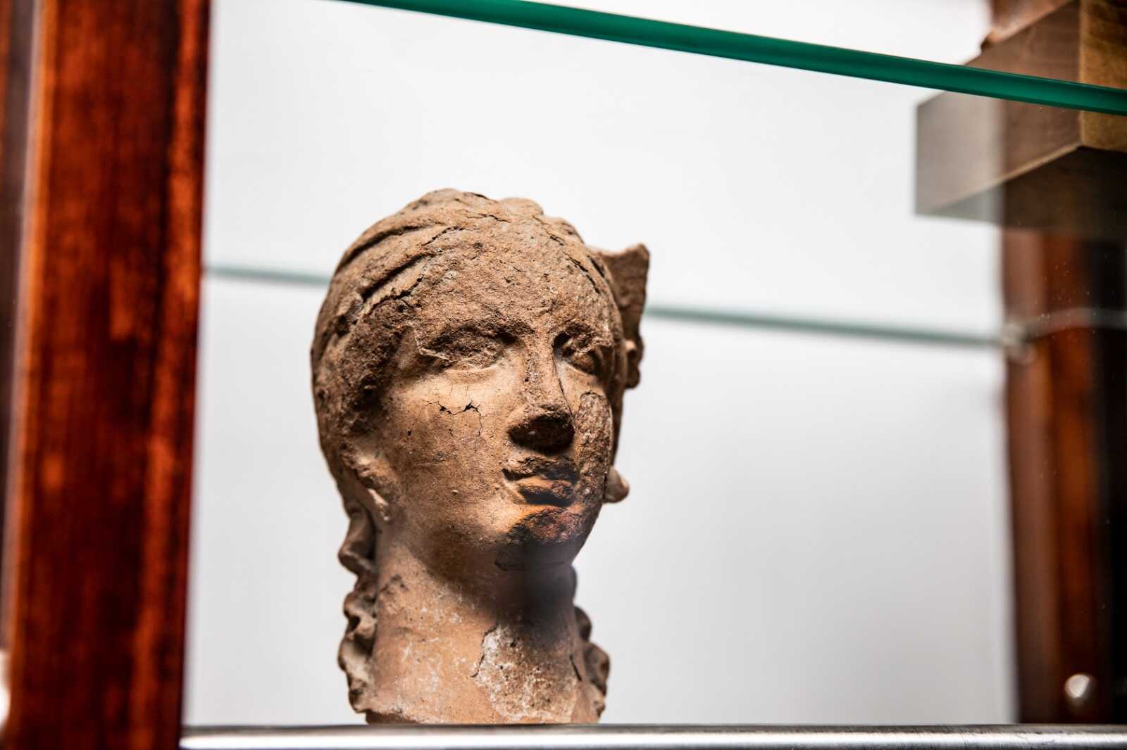 Nella foto – disponibile di seguito – uno degli oggetti esposti. Si tratta di una testina in terracotta databile tra la fine del IV e il III sec. a.C. proveniente da Paestum, probabilmente dal Santuario meridionale dove erano diffuse all’interno di depositi votivi. Le testine, parte di figure intere, rappresentavano nei santuari la fedele offerente, anche se sono note anche da corredi di tombe femminili come rappresentazione della defunta.
