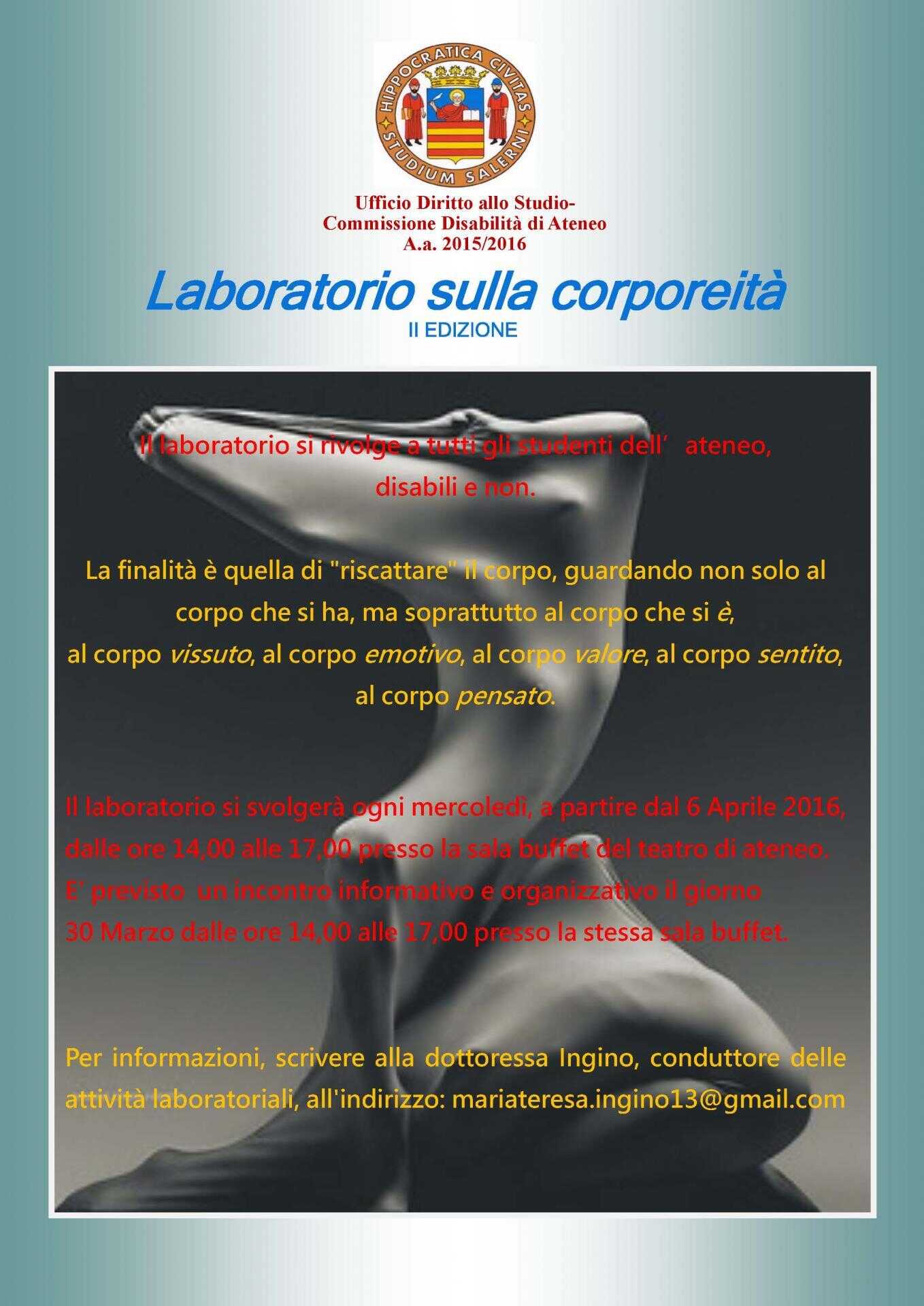Dal 30 marzo 2016 partirà la nuova edizione del Laboratorio sulla corporeità. Il laboratorio si svolgerà ogni mercoledì, a partire dal 6 aprile 2016, dalle ore 14,00 alle 17,00 presso la sala buffet del teatro di ateneo. È previsto un incontro informativo e organizzativo il giorno 30 Marzo dalle ore 14,00 alle 17,00 presso la stessa sala buffet. Gli obiettivi del laboratorio sono: