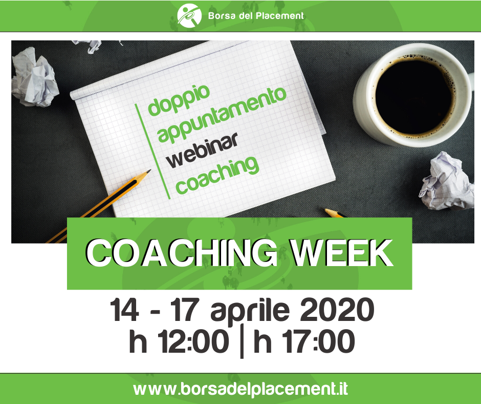 “Coaching Week” è una iniziativa pensata per prepararsi alla ripresa delle attività dopo l’emergenza attuale. Dal 14 al 17 aprile, è possibile partecipare a un percorso di webinar di orientamento al lavoro su temi che spaziano dall’obiettivo professionale alle soft skills, dal CV al colloquio di selezione, passando dall’utilizzo dei social network per la ricerca attiva di lavoro.