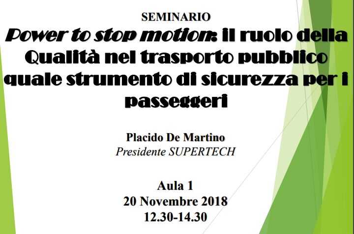 Il Dipartimento di Scienze AziendaliManagement & Innovation Systems dell’Unisa, con le Cattedre di Gestione e Controllo della Qualità, di Gestione e Controllo della Qualità dei Servizi Turistici e di Industrial & Quality Management, organizza il Seminario di studi dal titolo:Power to stop motion: il ruolo della Qualità nel trasporto pubblico quale strumento di sicurezza per i passeggeri. Ospite e relatore dell’incontro sarà il dott. Placido De Martino, Presidente SUPERTECH. L’appuntamento si terrà domani in Aula 1 dalle ore 12.30 alle 14.30.