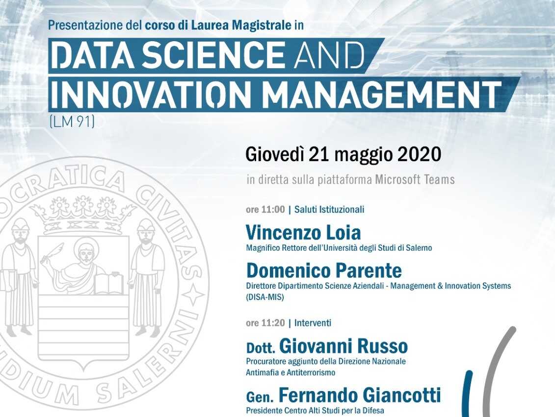 Per l’anno accademico 2020/21 una delle novità nell’offerta didattica dell’Università di Salerno è rappresentata dal corso di Laurea Magistrale, di nuova istituzione, in Data Science and Innovation Management (LM 91) del Dipartimento di Scienze Aziendali-Management & Innovation Systems. Il corso parte dal presupposto che l’avvento e la diffusione di nuove tecnologie digitali che abilitano la collezione e l’elaborazione di dati su larga scala, resa possibile grazie alla moderna Data Science, richiede di innovare significativamente il modo di operare in ogni organizzazione, sia che riguardi il mondo del business che quello governativo.