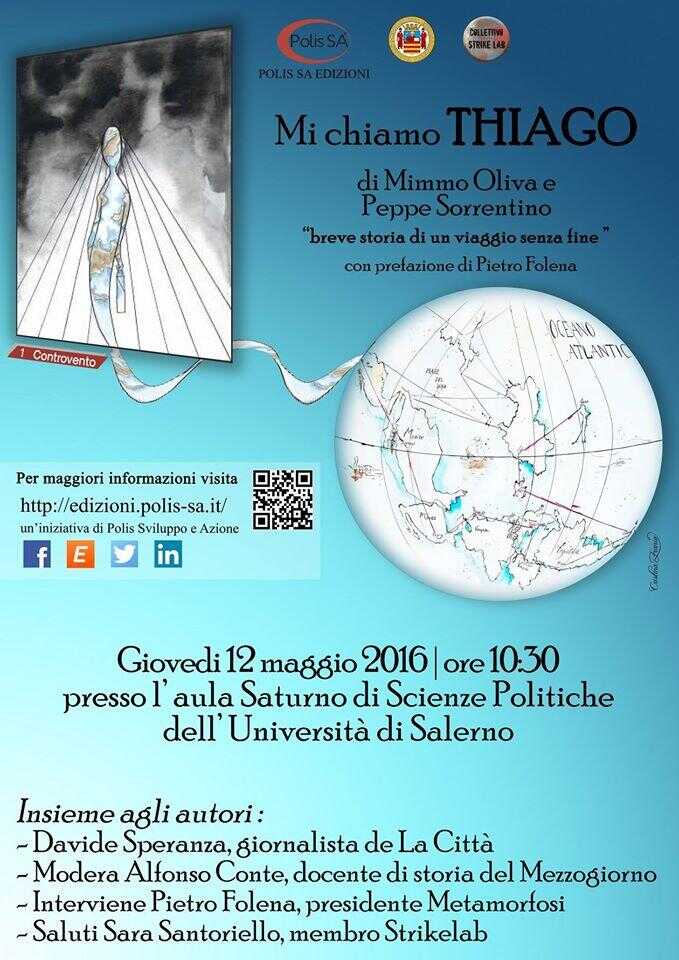 Giovedì 12 maggio 2016, alle ore 10.30, presso l’Aua Saturno di Scienze Politiche, si terrà la presentazione del libro “Mi chiamo Thiago”, opera di Mimmo Oliva e Peppe Sorrentino. Il testo è un romanzo-storia di un uomo dai mille volti, e della tante vite. Un uomo la cui presenza nella società è scomoda, il cui istinto di lotta e sopravvivenza si innalza e si rafforza dinanzi agli abusi di potere, e la cui emarginazione darà l’input per intraprendere una nuova e silenziosa guerra. Il libro accompagna i lettori in un viaggio metafisico ambientato nel Sud America. Ogni capitolo ci introduce il ricordo di una storia da cui prendono spunto riflessioni e snodi che ci portano lontano da un’idea puramente narrativa.