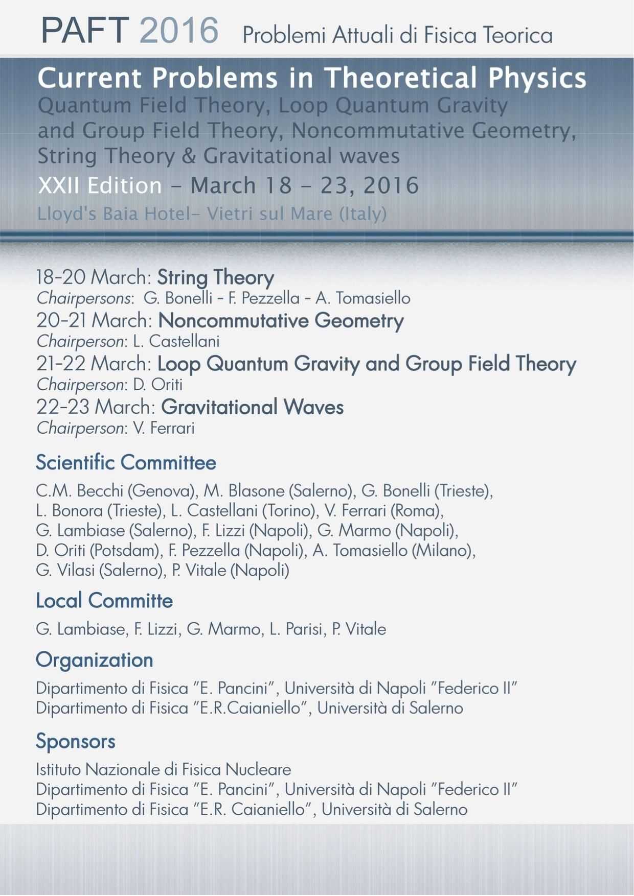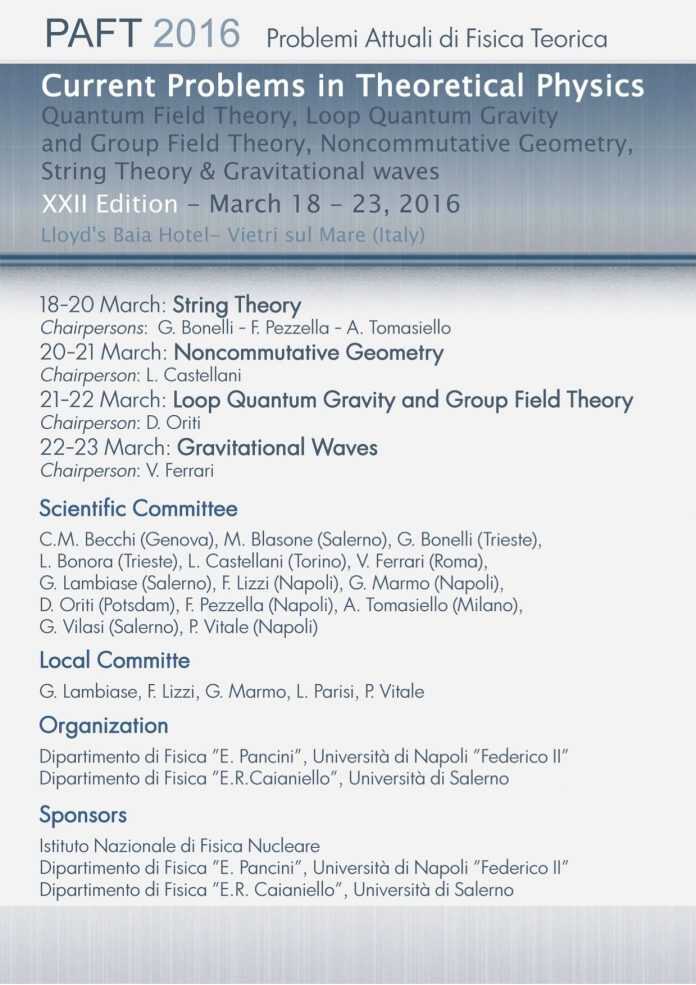 Dal 18 al 23 marzo avrà luogo la XXII edizione della Conferenza “Problemi Attuali di Fisica Teorica”. La conferenza, tradizionalmente concepita come uno dei due principali appuntamenti della fisica teorica italiana, avrà per oggetto temi di grande attualità quali: Teoria delle Stringhe, Geometria Noncommutativa, Loop Quantum Gravity e Group Field Theory, Onde Gravitazionali.