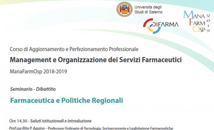 Venerdì 18 ottobre 2019 presso il Dipartimento di Farmacia dell’Università di Salerno (Aula di Agraria – Edificio F1), dalle ore 14:30 si terrà il Seminario-Dibattito “Farmaceutica e Politiche Regionali”, organizzato dal Centro di ricerca interdipartimentale PharmaNomics, nell’ambito del Corso di Perfezionamento post-lauream in Management e Organizzazione dei Servizi Farmaceutici – MANAFARMOSP 2018. Il Seminario dibattito è uno dei momenti conclusivi del progetto formativo “Corso di Perfezionamento in Management e Organizzazione dei Servizi Farmaceutici” (anno 2019) ed intende presentare l’esperienza della Regione Lazio e della Regione Campania nella farmaceutica, accesso ai farmaci e tavoli regionali, i modelli di reti e PDTA e affrontare le problematiche relative.